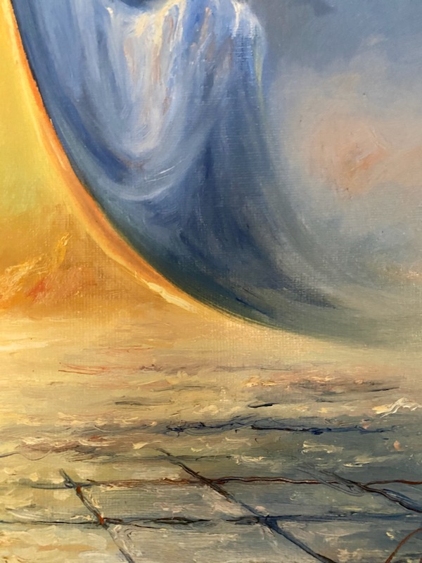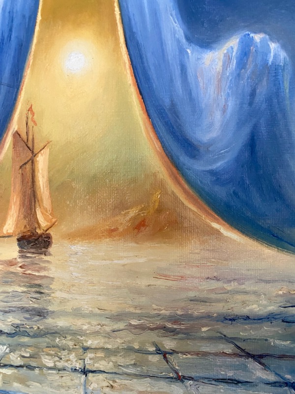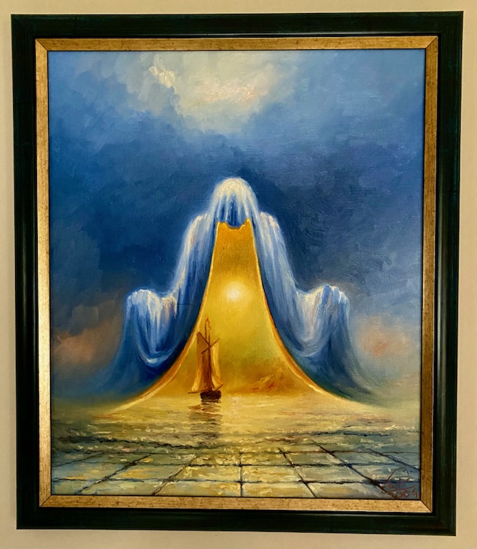 Na sprzedaż oryginalny obraz olejny autorstwa Mariusza Lewandowskiego, zatytułowany „Duch Morza”. Nastrojowa, surrealistyczna kompozycja przedstawia żaglowiec płynący w stronę świetlistej kaskady wody, która niczym kurtyna odsłania tajemniczą aurę światła. Połączenie miękkich błękitów i złotych tonów tworzy harmonijny, niemal baśniowy klimat, charakterystyczny dla twórczości Lewandowskiego.