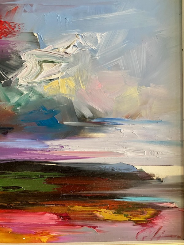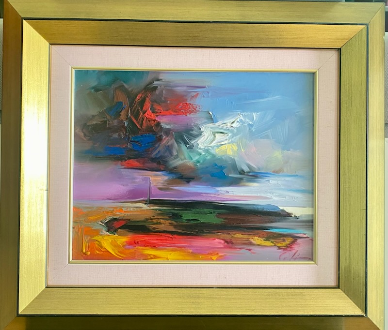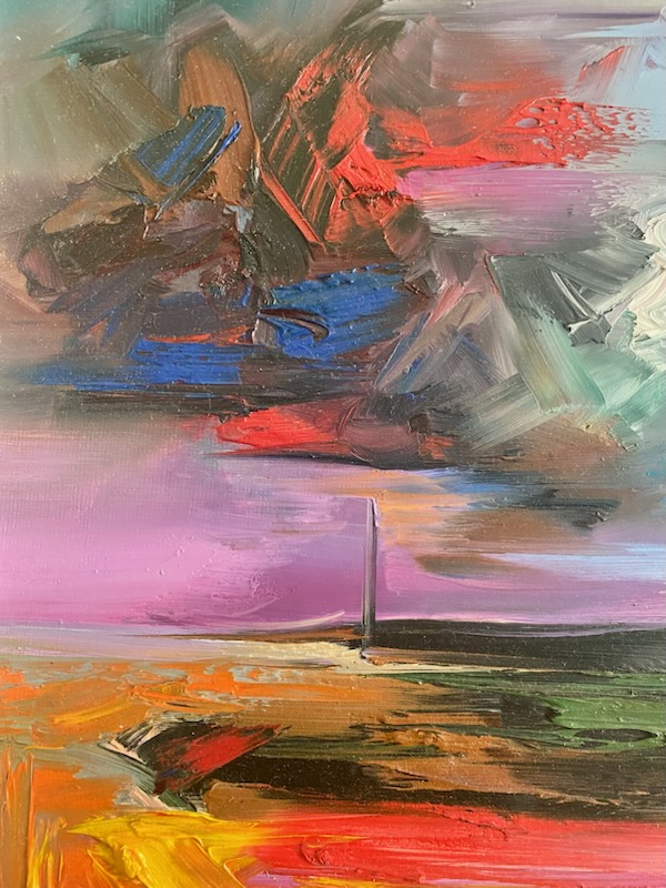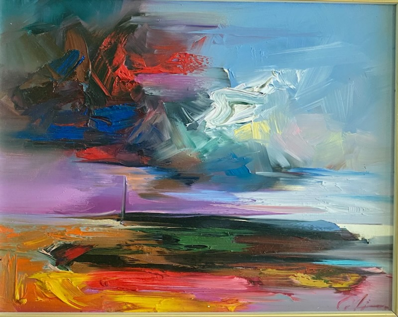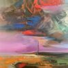 Oryginalny obraz olejny autorstwa Zdzisława Majrowskiego-Meyro to ekspresyjna, abstrakcyjna kompozycja pełna energii i intensywnych kontrastów kolorystycznych. Artysta operuje dynamicznymi pociągnięciami pędzla, tworząc sugestywny pejzaż na granicy figuracji i abstrakcji.