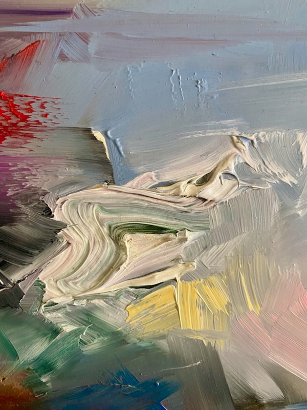 Bogata paleta barw — od soczystych czerwieni, żółci i pomarańczy, po chłodne błękity, fiolety i zielenie — tworzy wieloplanową, niezwykle żywą strukturę obrazu. Grubo nakładane warstwy farby olejnej podkreślają fakturę i nadają kompozycji głębi przestrzennej.